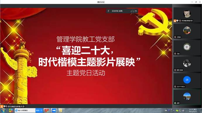 管理学院教工党支部于2022年5月13日,开展“喜迎二十大,时代楷模主题电影展映”主题党日活动,旨在深入学习宣传贯彻习近平新时代中国特色社会主义思想、党的十九大和十九届历次全会精神,迎接党的二十大胜利召开,大力宣传“时代楷模”厚重感人事迹、高尚道德情操,弘扬“爱国、敬业、诚信、友善”的价值准则,在支部营造学习先进、争当先进、赶超先进的浓厚氛围。