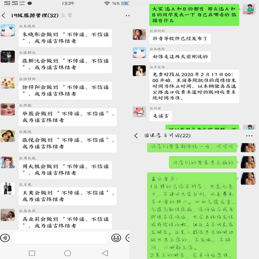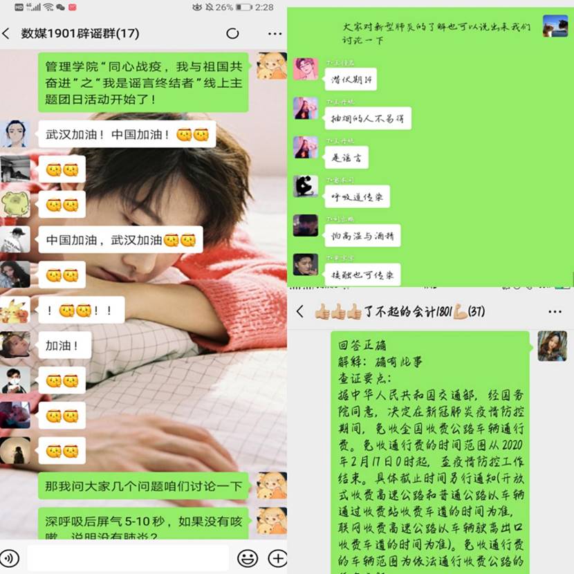 为进一步加强同学们防疫知识储备,维护科学、良好的抗疫环境。2月17日,管理学院团委开展“同心战疫,我与祖国共奋进”之“我是谣言终结者”线上主题团日活动。疫情以来,谣言四起,作为新时代大学生要讲科学,求真知。各支部纷纷组织“谣言终结者”、“科普知识答题”等研讨活动,终结谣言,精准防控。