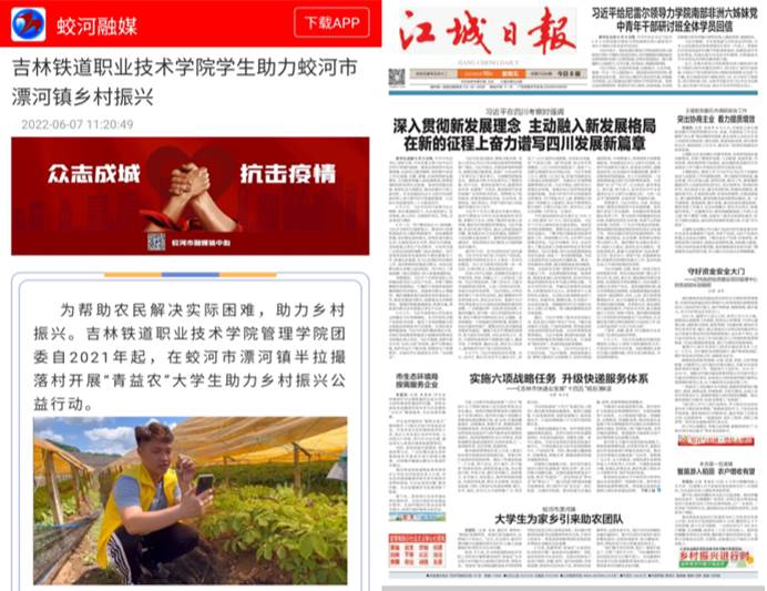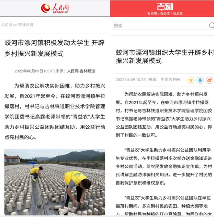 自2018年起至今,吉林铁道职业技术学院管理学院团委书记高露老师带领的“青益农”大学生助力乡村振兴公益团队,运用融媒体专业学生的专业优势,发展电商助力乡村振兴。自活动开展以来,效果良好,得到了村民的一致认可。被人民网、中国吉林网、蛟河市委宣传部、江城日报相继报道。