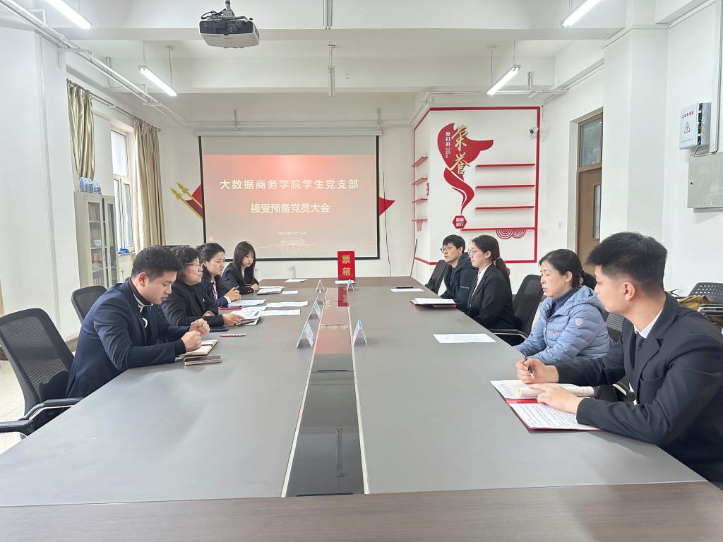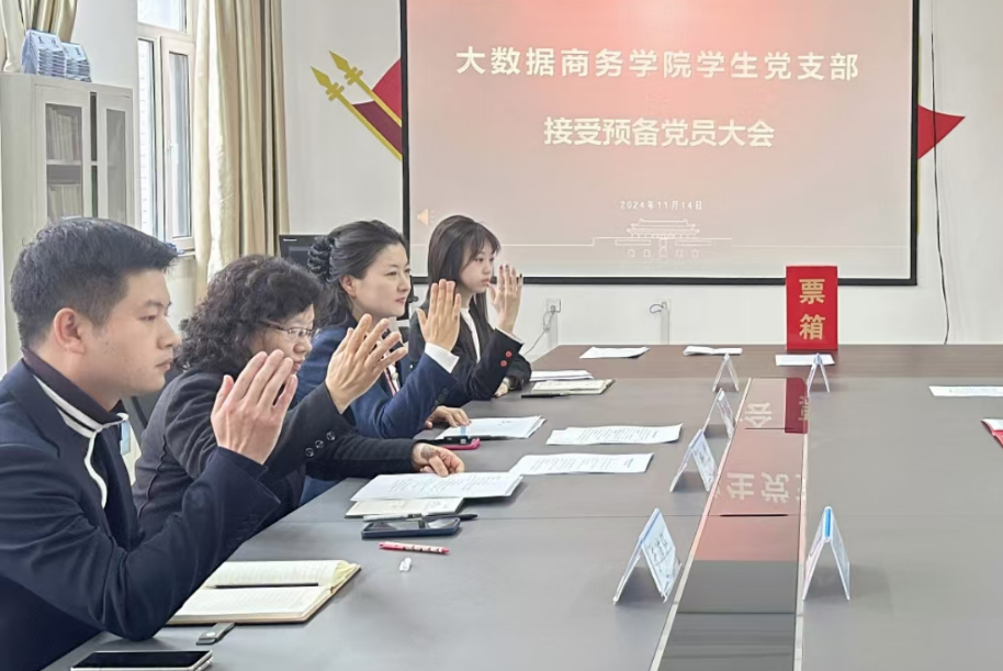 为进一步加强党的基层组织建设,培养更多优秀的青年党员。2024年11月14日下午,大数据商务学院学生党支部隆重召开了2024年接收预备党员大会。此次会议的核心议题是讨论并决定接收新一批预备党员的相关事宜。会议在学院领导的高度重视和精心组织下顺利进行。学生党支部全体党员和入党介绍人金明姬、王元博参加会议。