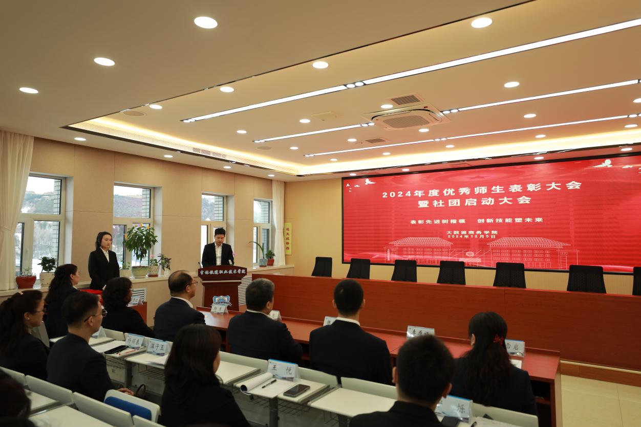 数据商务学院秉承“匠心培育英才,技能成就未来”的教育理念,于2024年12月5日在第三会议室隆重举行了2024年度分院优秀特质师生表彰大会及社团启动大会。此次大会不仅是对过去一年中表现突出的师生进行表彰,更是对未来一年社团活动的全面启动。学校党委书记陈煜平、校长曹炳志、副校长李原福等校领导受邀出席了此次盛会,与全体师生共同见证这一重要时刻。