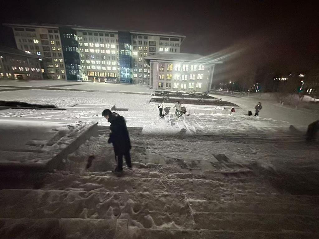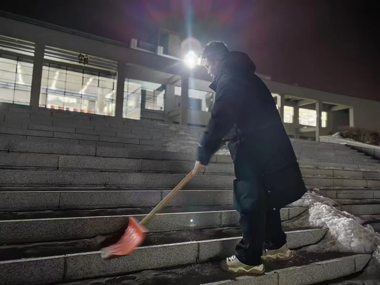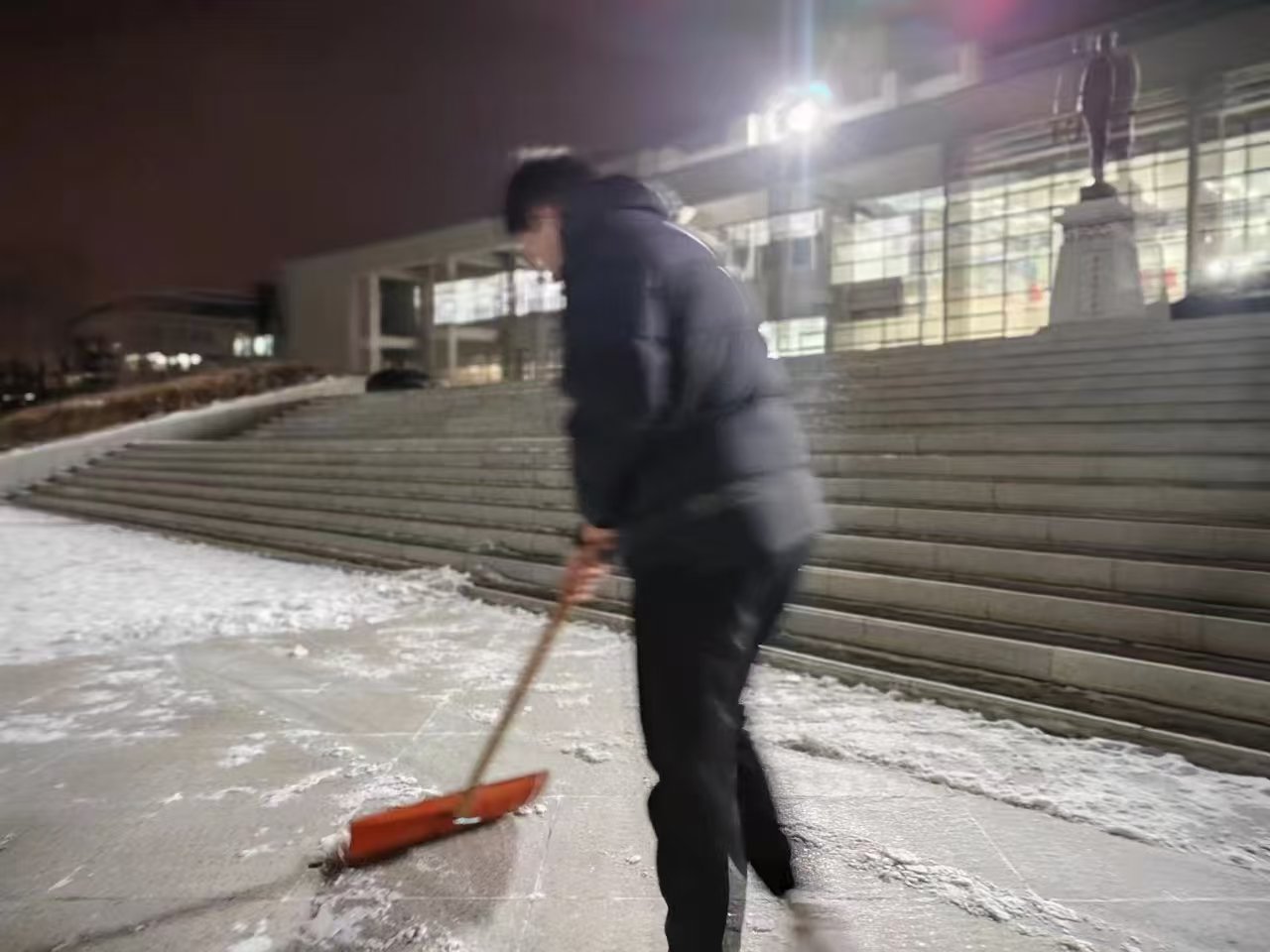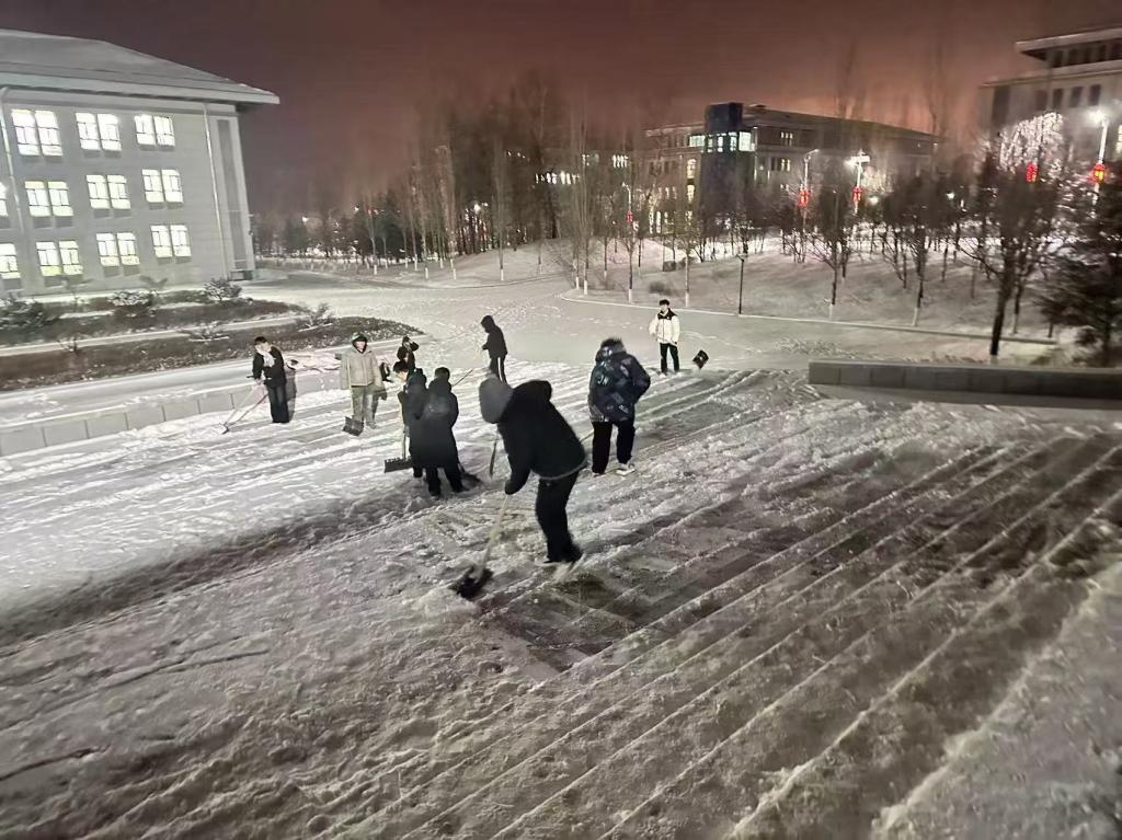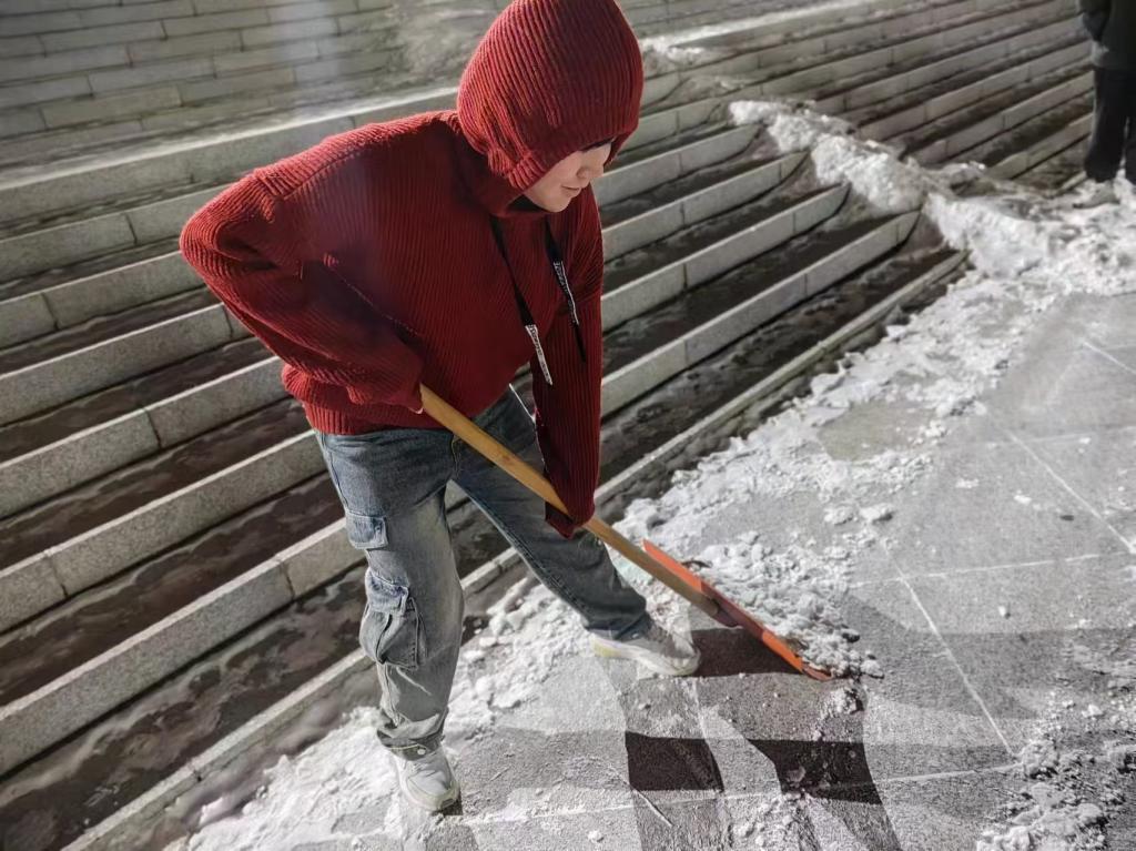 在长达 3 个小时的清雪过程中,大学生们充分展现出坚韧不拔的意志和团结协作的精神。面对厚重的积雪和坚硬的冰层,他们毫不畏惧。经过共同努力,共清理了约 5000 平方米的校园图书馆门前台阶、道路和活动区域,为师生们开辟出一条条安全通道。