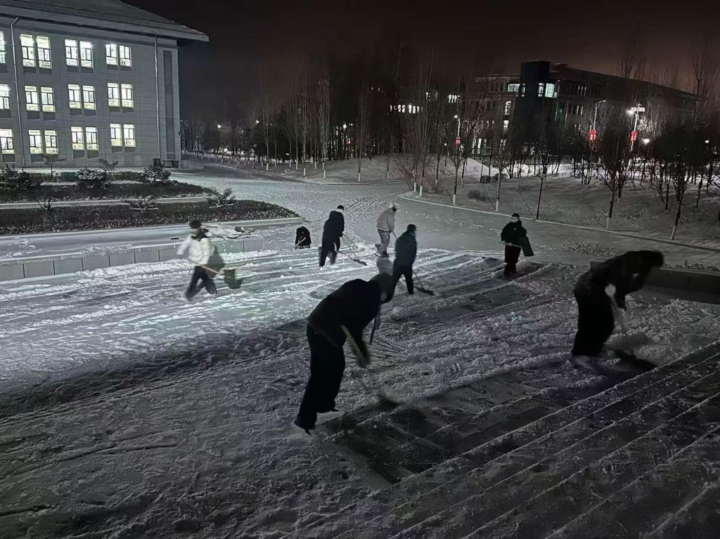 活动当日,在辅导员的动员下,来自不同专业的 200 余名大学生迅速响应,纷纷领取清雪工具,奔赴各自负责的区域。尽管室外温度低至零下 10 摄氏度,寒风凛冽,但这丝毫没有影响大家的清雪热情。他们分工明确,配合默契。10 个小组同步开展工作,其中 5 个小组负责用推雪板铲除主干道上的积雪,每块推雪板一次能清理约 1.5 平方米的积雪面积;3 个小组用铁锹清理结冰路面,平均每人每小时能清理约 10 平方米的结冰区域;另外 2 个小组则用扫帚清扫残留雪块。