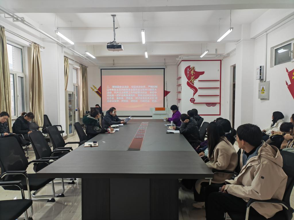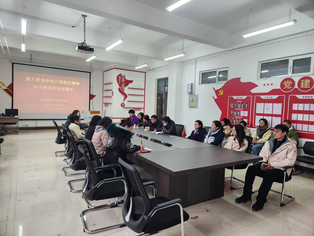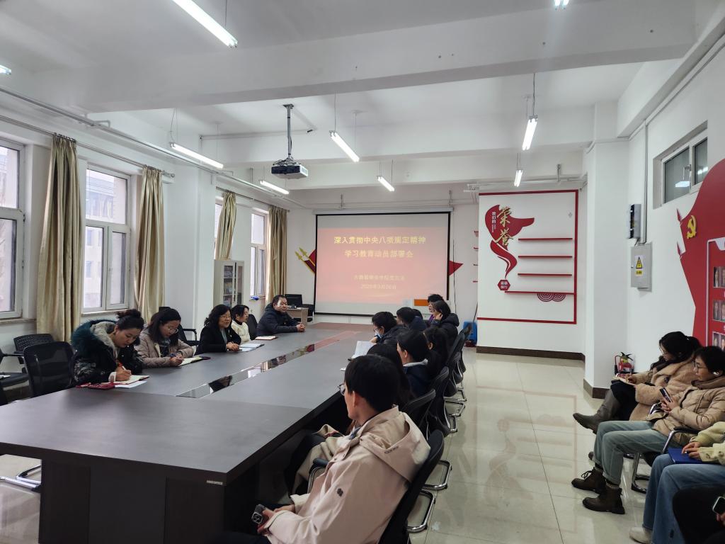 2025 年 3 月 26 日,大数据商务学院党总支在党团活动室召开关于贯彻落实中央八项规定部署会暨第一次集中学习教育大会。会议由党总支书记杨秀主持,学院全体教师参加,校党委办公室赵一潼莅临督导。