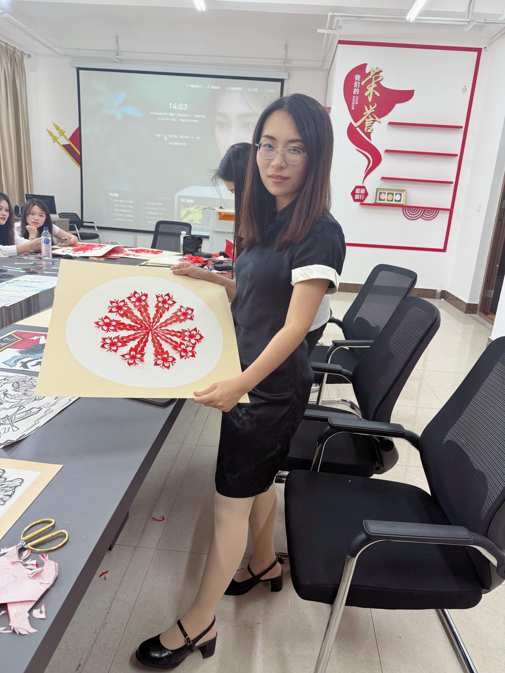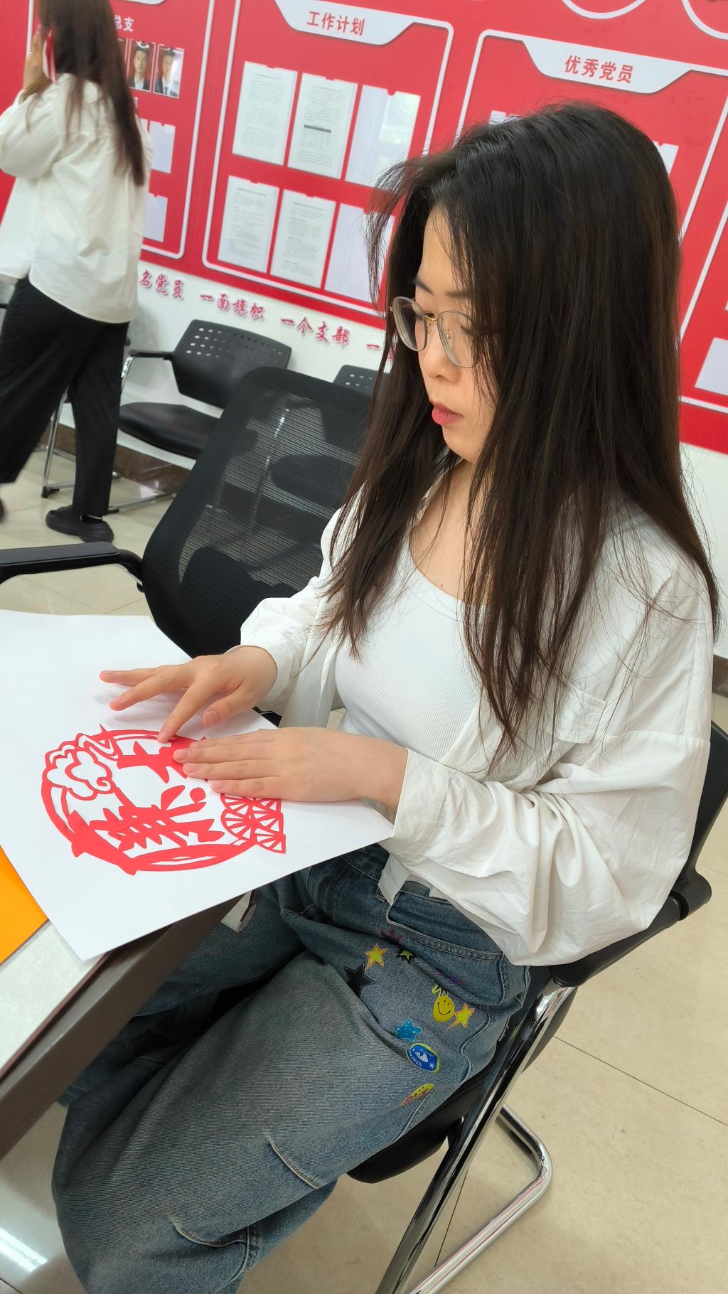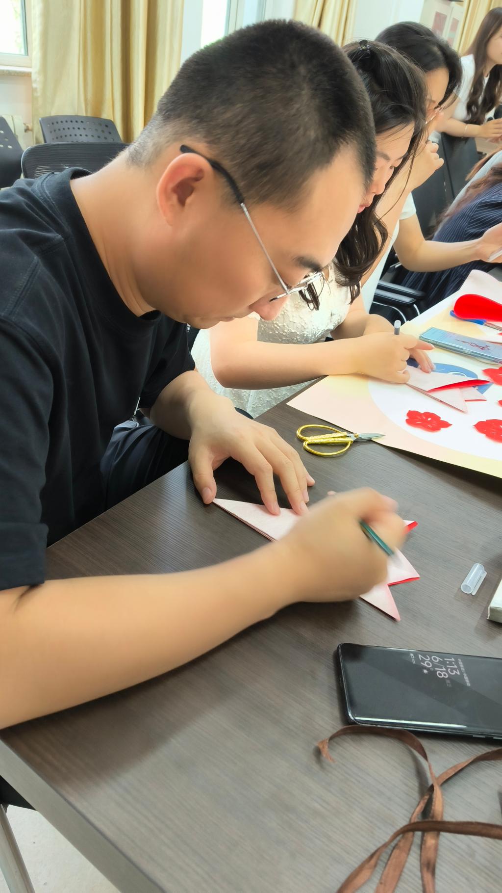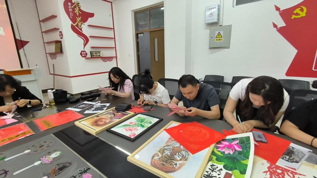活动现场气氛热烈,党总支书记发表开场致辞,深刻阐述活动意义,强调廉洁文化建设重要性,号召党员积极投入。随后,剪纸指导老师详细讲解剪纸技巧与示范,展示廉洁主题剪纸作品,红色宣纸在剪刀下化作莲花、竹子等寓意清正廉洁图案,党员教师沉浸其中,汲取灵感。创作环节,教师们依据模板或自行设计,全神贯注投入剪纸创作,互相交流学习,分享对廉洁文化理解,指导老师巡回答疑解难,现场一片专注创作氛围。