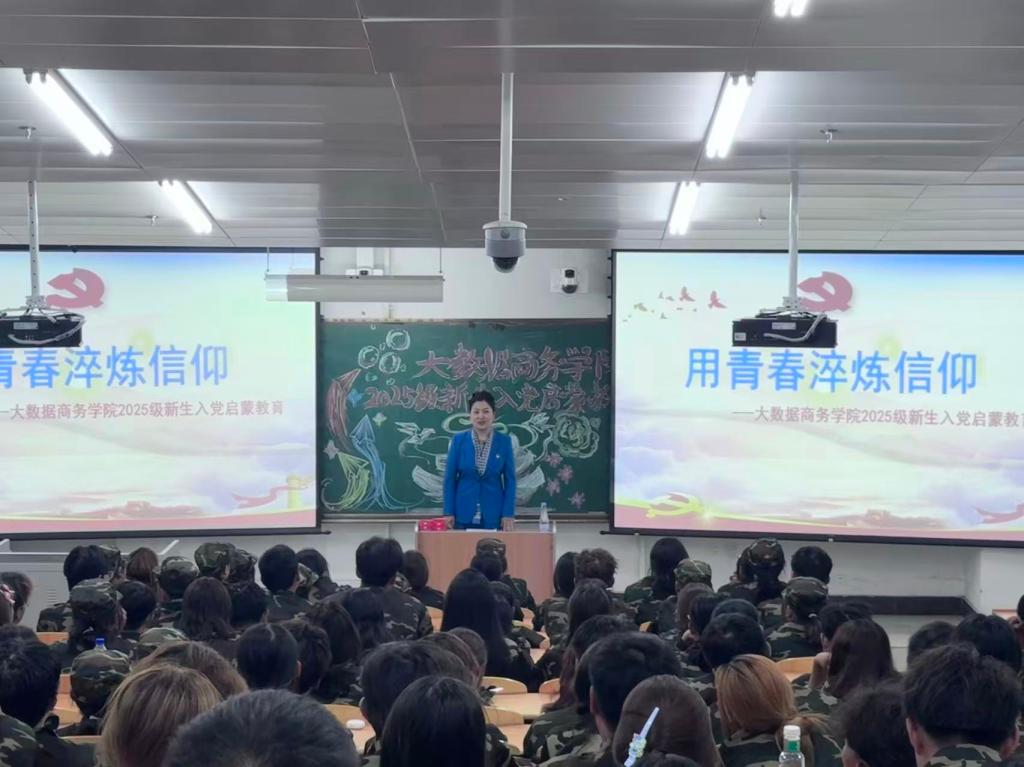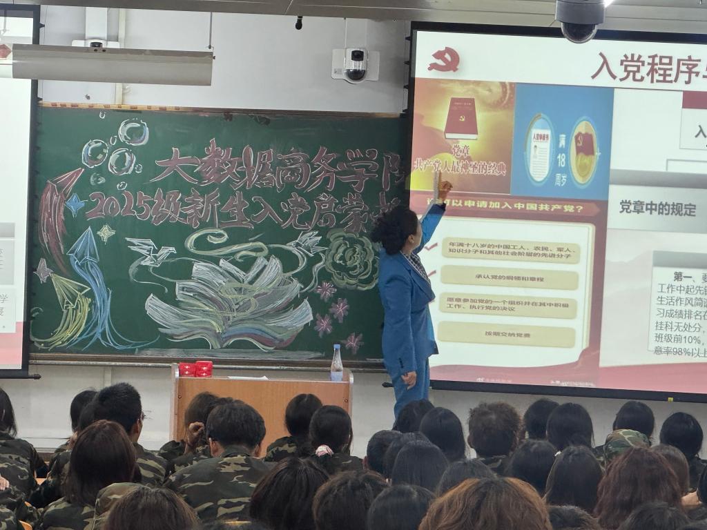 为帮助新生扣好“思想第一粒扣子”,引导青年学子树立正确政治方向,2025年9月8日,大数据商务学院学生党支部在教学楼西阶梯2025级新生入党启蒙教育课。学院党总支副书记、学生党支部书记张慧茹主讲,全体2025级新生到场参加,开启了新生思想成长与理想信念培育的重要一课。