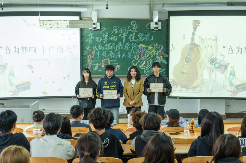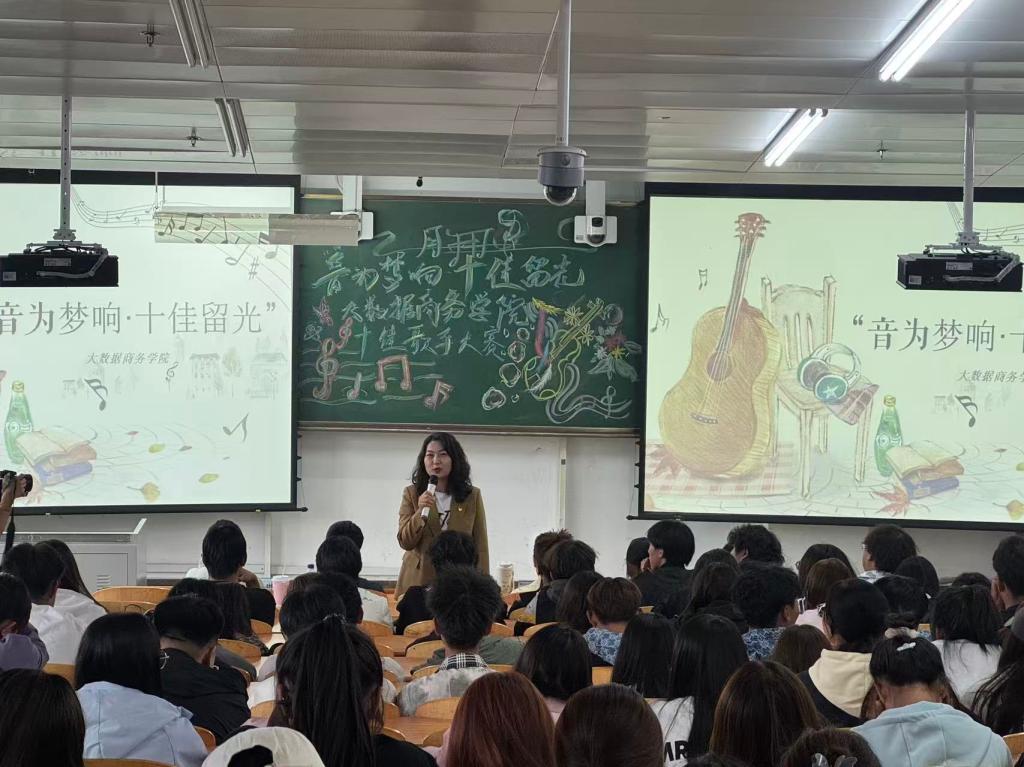 为丰富新生校园文化生活,展现新生青春风采,大数据商务学院9月17日下午在教学楼阶梯教室西 201 举办新生十佳歌手决赛。此前经过激烈预赛选拔,10 组优秀学生个人与团体脱颖而出,成功晋级决赛,现场气氛热烈,吸引众多师生到场观看。决赛评委阵容专业,包括学院党总支副书记、学办主任、团委书记,以及大一班主任代表王琳、邢羽桐、施楠,确保评审公平公正。