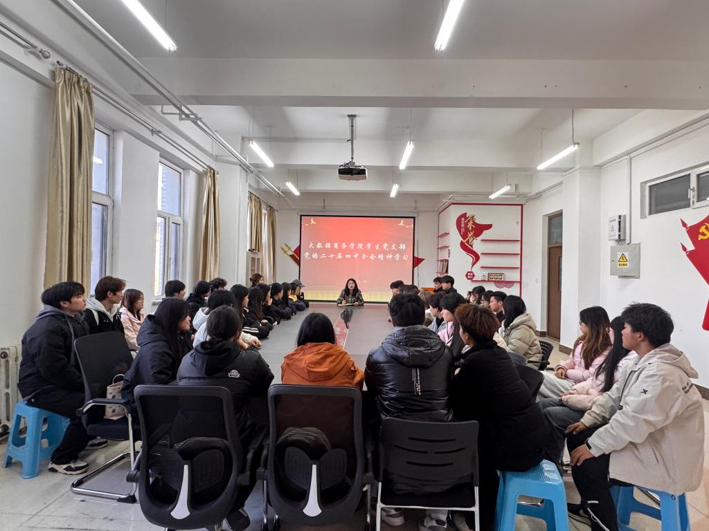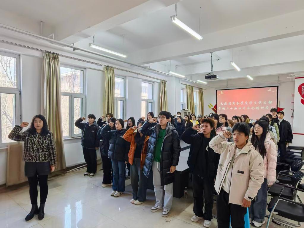 活动伊始,学生党支部书记带领全体人员集中学习二十届四中全会精神文件,重点解读了全会提出的 “十五五” 时期发展目标与 “加快高水平科技自立自强”“建设现代化产业体系” 等核心部署。学校党委书记陈煜平出席活动并讲话,她强调,青年学子要深刻领悟 “两个确立” 的决定性意义,将专业所学与国家战略需求紧密结合,在大数据、商务管理等领域练就过硬本领,以青春之力服务高质量发展大局。随后,全体人员观看了全会相关视频资料,直观感受新时代党和国家事业发展的重大成就与宏伟蓝图。在庄严的党旗下,教师党员带领入党积极分子重温入党誓词,铮铮誓言彰显初心使命,凝聚奋进力量。