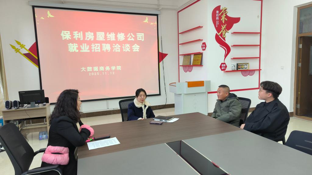 2025年11月12日下午,大数据商务学院围绕2026届毕业生就业需求,同步开展保利房屋维修公司专场就业招聘洽谈会与招聘宣讲会。其中,校企洽谈会在308会议室举行,学院院长王雪岩、党总支副书记兼 2026 届毕业年级辅导员张慧茹、教研室主任张博与保利维修公司相关领导面对面交流,就企业人才需求标准、岗位能力要求、校企实习合作等核心议题深入沟通,为后续毕业生精准就业搭建对接桥梁。