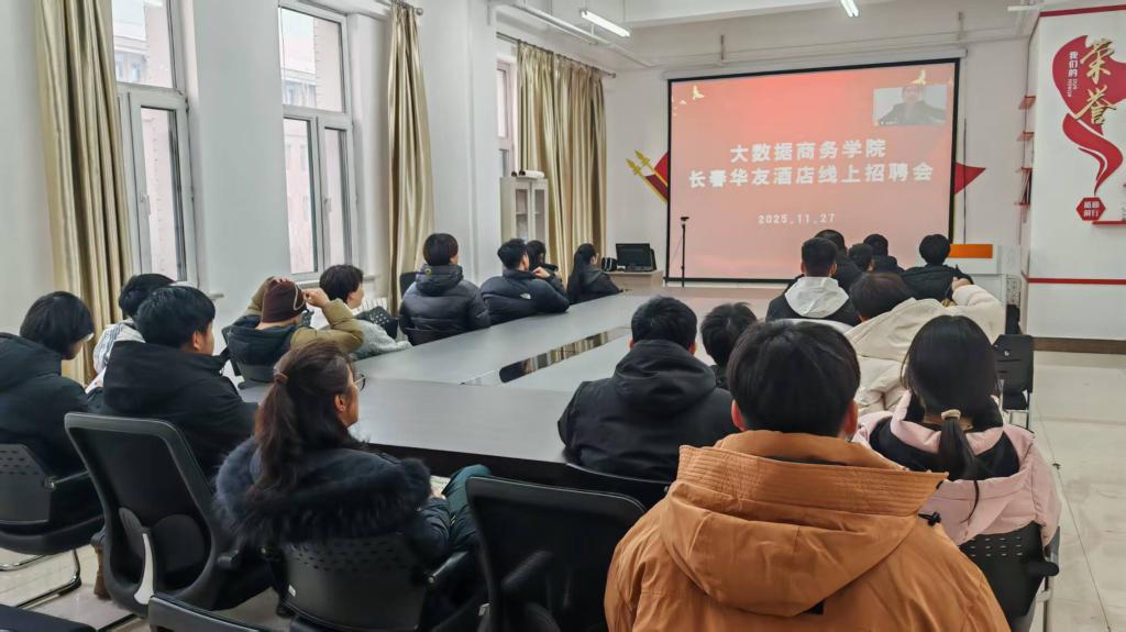 2025年11月27日下午,大数据商务学院联合长春华友酒店管理有限公司举办线上招聘宣讲面试会。主会场设于学院308会议室,会计专业实训室设分会场,毕业年级学生以“线下主会场 + 分会场直播”形式参与,酒店人力资源行政总监张女士主讲,学院毕业年级辅导员全程组织,党总支副书记到场指导。宣讲中,张总监介绍,长春华友酒店2017年成立,隶属世界汽配500强宁波华翔集团,为五星级商务酒店,2025年入围长春党政机关会议定点采购项目。员工可享免费食宿、健身房与泳池等设施,定期参与团建旅游;此次重点招聘销售经理(底薪4000元+提成,综合8000-13000元/月)、宴会主管(4000-5000元/月)等岗位,福利含五险一金、绩效奖金,大专生平均月薪6500元。