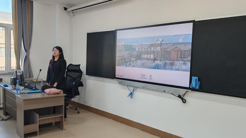 为拓宽 2026 届毕业生就业渠道,搭建校企精准对接平台,2025年12月5日上午,大数据商务学院特邀长白山万达宾馆群到校开展专场就业宣讲暨招聘会。活动在一实训楼406教室顺利举行,宾馆人力资源部李经理、王经理担任主讲嘉宾,学院毕业年级辅导员张慧茹精心组织,近百名 2026届毕业生到场参与,现场求职氛围浓厚。