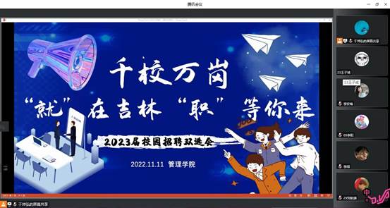 为解决毕业生就业难的问题,管理学院积极联系24家合作用人单位,并于2022年11月11日下午,举办了2023届毕业生“’就’在吉林‘职’等你来”第一季校园招聘“云端”双选会,促进毕业生更充分、高质量就业,最大程度满足毕业生求职需要。会议由毕业年级辅导员于沛弘主持,分院2023届毕业生线上线下全员参加。