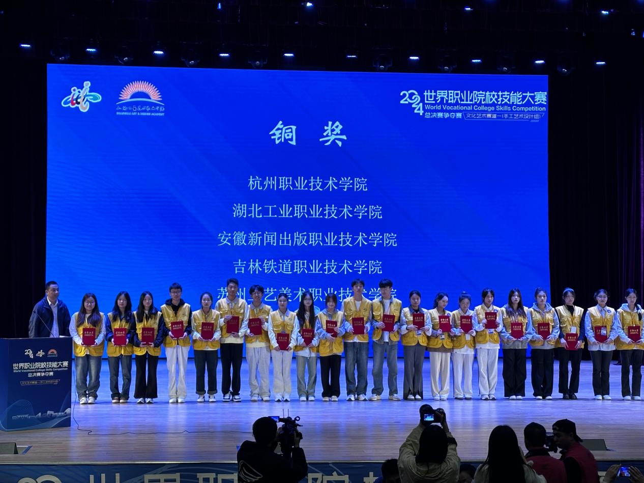 10月24日至27日,2024年世界职业院校技能大赛总决赛争夺赛文化艺术赛道——手工艺术设计赛项在上海工艺美术职业学院举行。全国55支代表队、200余名学生参加本次比赛。经过激烈角逐,由大数据商务学院张博、张馨心老师指导,学生丁莹、赵子元、张嘉斌、刘思霖四位同学组成的代表队凭借卓越表现和出色的团队协作精神,最终从55支队伍中脱颖而出,喜获铜奖。